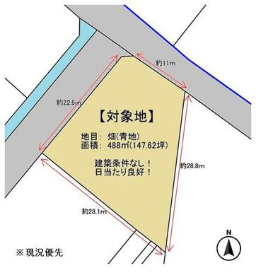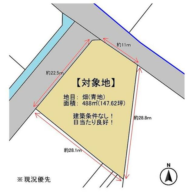 | 接道状況 | 北東4.8m 公道 接面11.0m 北西7.0m 公道 接面22.5m | 地目 | 畑 |